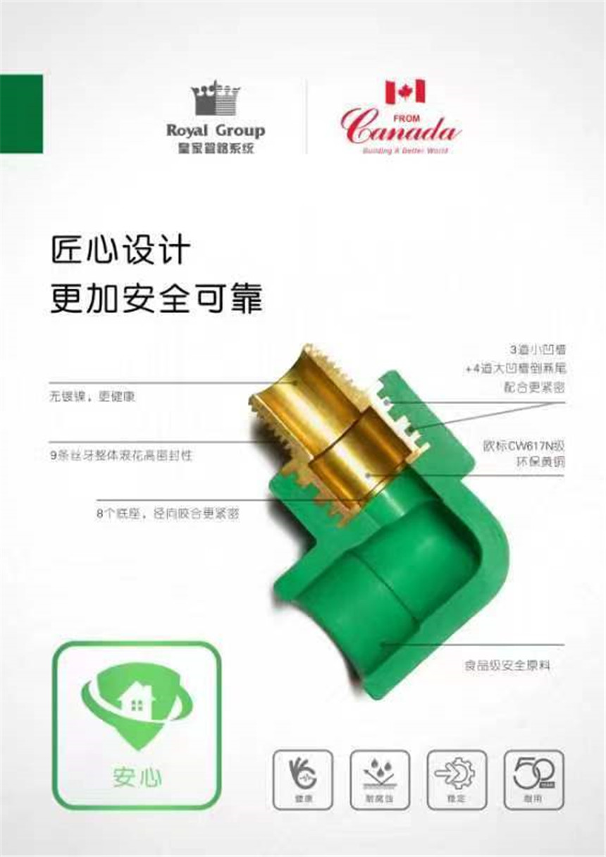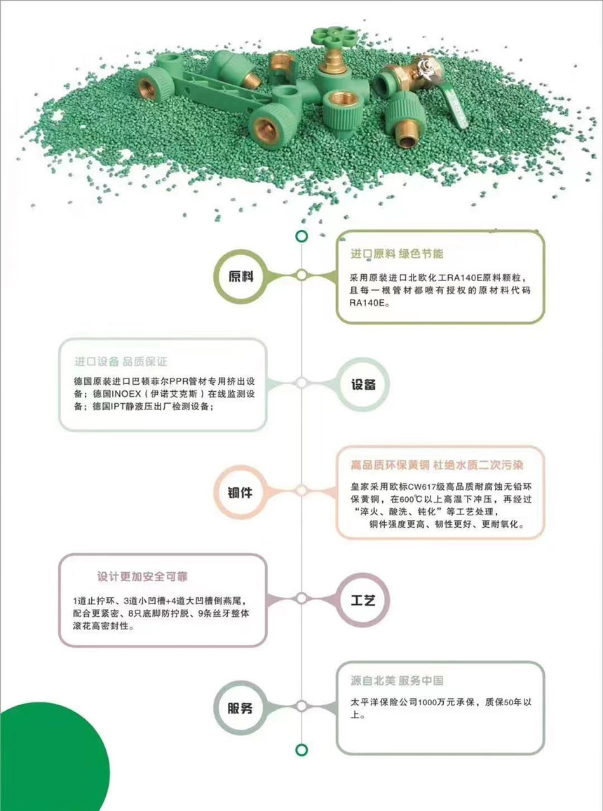 PP-R冷熱水管路系統(tǒng)皇家PP-R管材、管件件均采用進口北歐化工(博祿)PP-R樹脂顆粒,采用技術(shù)先進的巴頓菲爾擠出機設(shè)備生產(chǎn)。PP-R管材按照GB/T18742.2-2002,管件按照GB/T18742.3-2002組織生產(chǎn)。PP-R管以質(zhì)輕耐用、綠色環(huán)保、使用壽命長等眾多優(yōu)點廣泛運用于室內(nèi)冷熱給水系統(tǒng)、純凈水系統(tǒng)和地板采暖系統(tǒng),越來越受到人們的青睞。